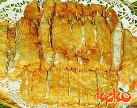 4.猪肥肉膘片成长6 厘米、宽4 厘米的薄片4 片,用打好的糊逐个抹上;