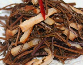 肉丝烧拳菜:'1.将干拳菜(蕨菜)放开水中涨发,加盖焖软,再放开水锅中加食碱焖煮至透;2.多换几次水,使其洗净碱味和黑水,择去根,切成了3.5 厘米长的段,用开水...    详细介绍