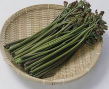 Fiddlehead Fern蕨菜为蕨类植物蕨还处于卷曲未展时的嫩叶,蕨菜是野菜的一种。它所烹制的菜肴色泽红润、质地软嫩、清香味浓,而且富含氨基酸、多种维生素、微量元素,还包括蕨素、蕨甙、甾醇等特有的营养素,被称为“山菜之王”,而且是不可多得的野菜美味。蕨菜可鲜食,但较难以保鲜,所以市场上常见其腌制品或干品,现在我国蕨菜大量用于出口。