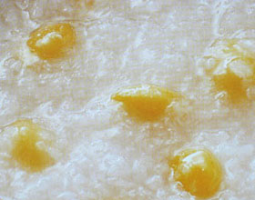 白果粥:'1.洗净白米,用少许精盐拌匀。白果去壳切开,去掉果中白心。腐竹浸软切细。2.将清水注入器皿内,用高火煮12分钟沸后,下入米、白果、腐竹同煮。3.高火...    详细介绍
