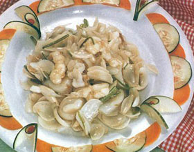 滑炒虾球:'1.中虾去头、皮、尾,由脊部片口挑去沙线,用盐、味精、料酒抓匀,加蛋清及水淀粉上浆备用;2.炒勺烧热加植物油,温油中将虾仁划出;3.白果、花菇和青...