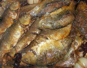 五香酥鱼:'1.将鲫鱼刮洗干净;2.大葱洗净切段;姜、蒜洗净切片备用;3.将锅底里垫上一层竹垫,先将鲫鱼放在竹垫上整齐排列(头朝外、肚朝上,侧放),把各种香料...    详细介绍
