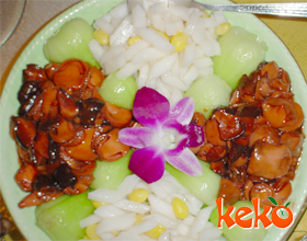 植物四宝:'1.水发花菇剪去根蒂,洗净挤干水;2.将花菇放入盆里,加鸡汤150毫升、鸡油20克,用旺火蒸1 小时取出;3.鲜笋嫩尖顺长切成1 厘米见方粗的条;4.笋嫩尖...
