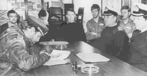 马岛阿军司令梅嫩德斯在停火协议上签字