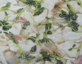 3.锅内留少许油,加高汤、火腿、冬笋、盐、胡椒粉烧沸,用湿淀粉勾薄芡,放入鸡片,豌豆苗入味,起锅装盘,淋上鸡油即成。