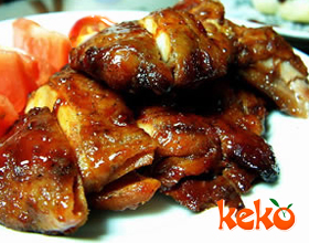 9.然后夹进铁丝网夹内,上叉,在烤炉内反复熏烤,至色黄皮酥后出炉,抹以香油, 改刀成菱形块装盘;