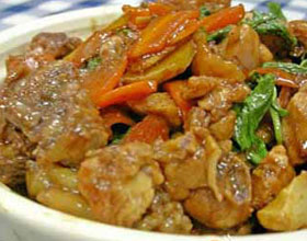 10.将切好的主料全部装入砂锅,放入葱姜,下三杯调味品,加盖待用;