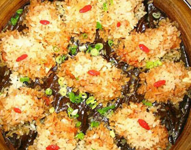 蒸糯米肉丸子:'1.猪肉泥放盆中,徐徐加入葱姜汁,沿一个方向用力搅打上劲,然后放入鸡蛋和调料搅拌,最后加入葱姜末、荸荠末、大白菜心末,做成24个丸子。2.每个丸子...