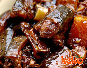 大蒜烧鳝鱼:'1.鳝鱼剖开去内脏、骨及头尾,洗净,切成长约4厘米的段;2.大蒜剥去皮洗净,姜切片,葱切细花,豆瓣剁细;3.炒锅内下油75克,烧至七成热时,放入鳝鱼...    详细介绍