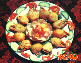 脆炸蟹钳:'1.将蟹宰杀取鳌,用沸水氽约10 分钟至刚熟;2.取其前节,用刀轻拍螫壳,拆出肉;3.留螫壳末端壳及鳌内扇骨;4.虾仁斩剁成茸,加入蛋清、料酒、盐,顺...
