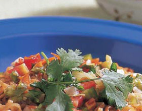 意式番茄牛肉凉面:'1.将面烫熟,捞起后泡冷水至面条不烫即可,沥干装盘备用;2.将大蒜头末、洋葱末、九层塔碎片15克炒香;3.加入绞碎的牛肉、番茄糊、番茄酱一起炒匀;4...