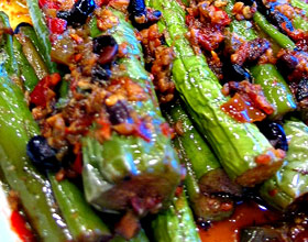 肉末茄子:'1.茄子洗净后切成约6公分长的段,再对剖成4长条;2.锅中倒入适量的油烧热,放入茄子用中火炸软后捞出;3.锅中留油,放入绞好的肉炒散,再放入蒜末炒香...