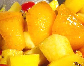 5.将苹果、梨、菠萝、橙子加糖汁拌匀,点缀上红、绿樱桃即可。