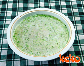 3.中火烧热炒锅,下油,烹黄酒,加开水1500毫升、精盐、味精、胡椒粉、香油和牛肉茸,烧至微沸,用湿淀粉调稀勾芡;