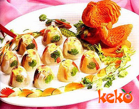 14.取小茶杯(潮汕喝功夫茶的小杯)24 只,每只涂上薄薄的一层鸡油,各放入豌豆一粒垫底,在旁边放入消毒的香菜叶、鸡蛋白、火腿、鸡肉各一件互相整齐地间隔开(鸡肉有皮的一面与芫荽叶贴向杯壁);