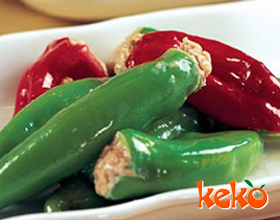 2.青椒和红椒切分别抹生粉,里面填满虾肉馅,然后放入热油锅中(馅朝内),以小火煎约1分钟,淋下生粉5克、清水10克勾芡,即可翻面并盛至盘中。